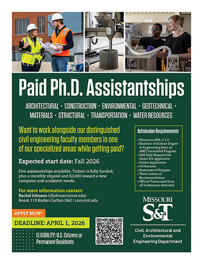Missouri S&T’s civil, architectural, and environmental engineering (CArEE) Department prepares students to thrive in a future AI driven world. Our degree programs focus on engineering fundamentals, critical thinking, creativity, and ethical leadership for the benefit of the public good. With strong job prospects, competitive salaries, and a curriculum rooted in hands-on learning, our degree programs equip graduates to harness technology in building a better world. Missouri S&T produces “street-ready engineers” by blending human insight with AI and data-informed tools to address today’s needs and tomorrow’s challenges for the natural and built environments. Our degrees offer a secure, future-focused path to a purposeful and impactful engineering career.